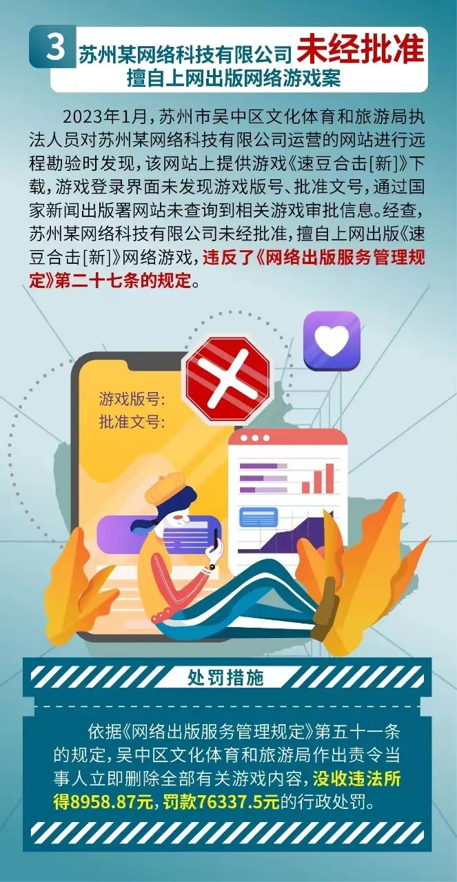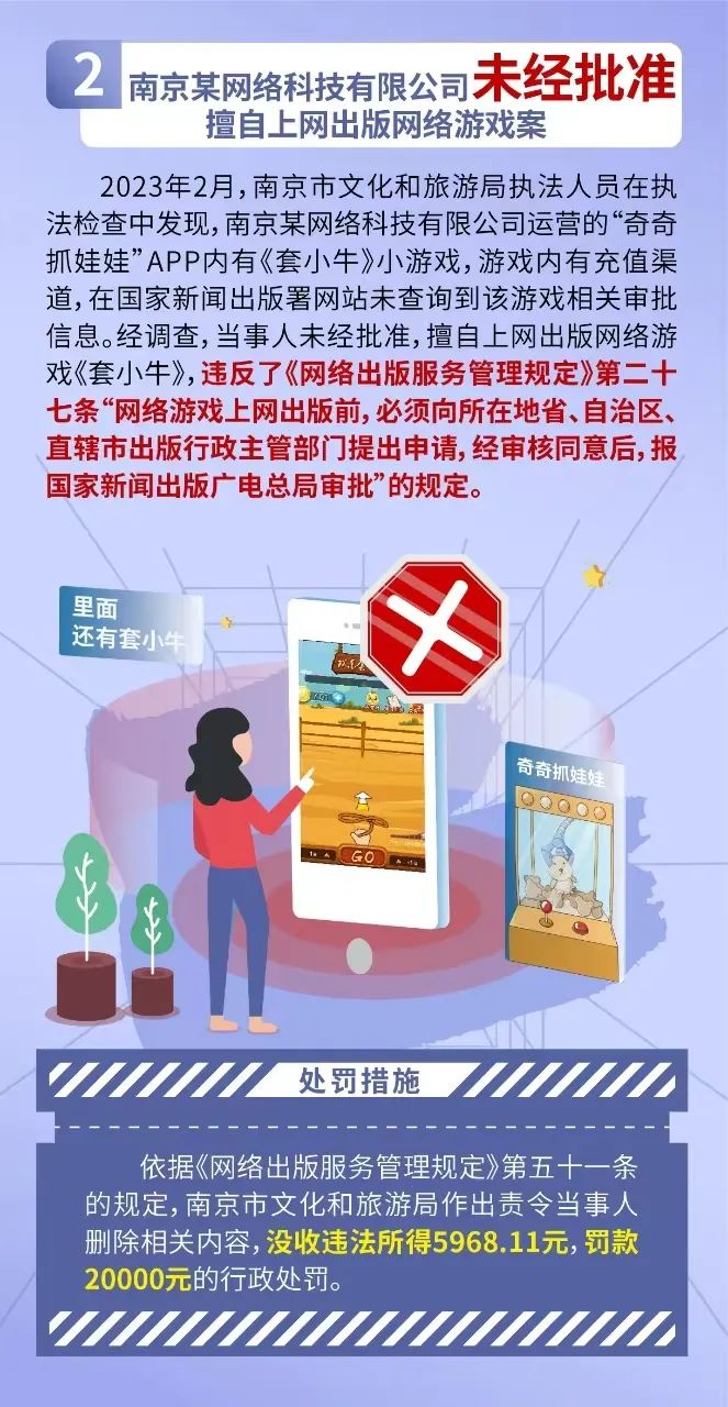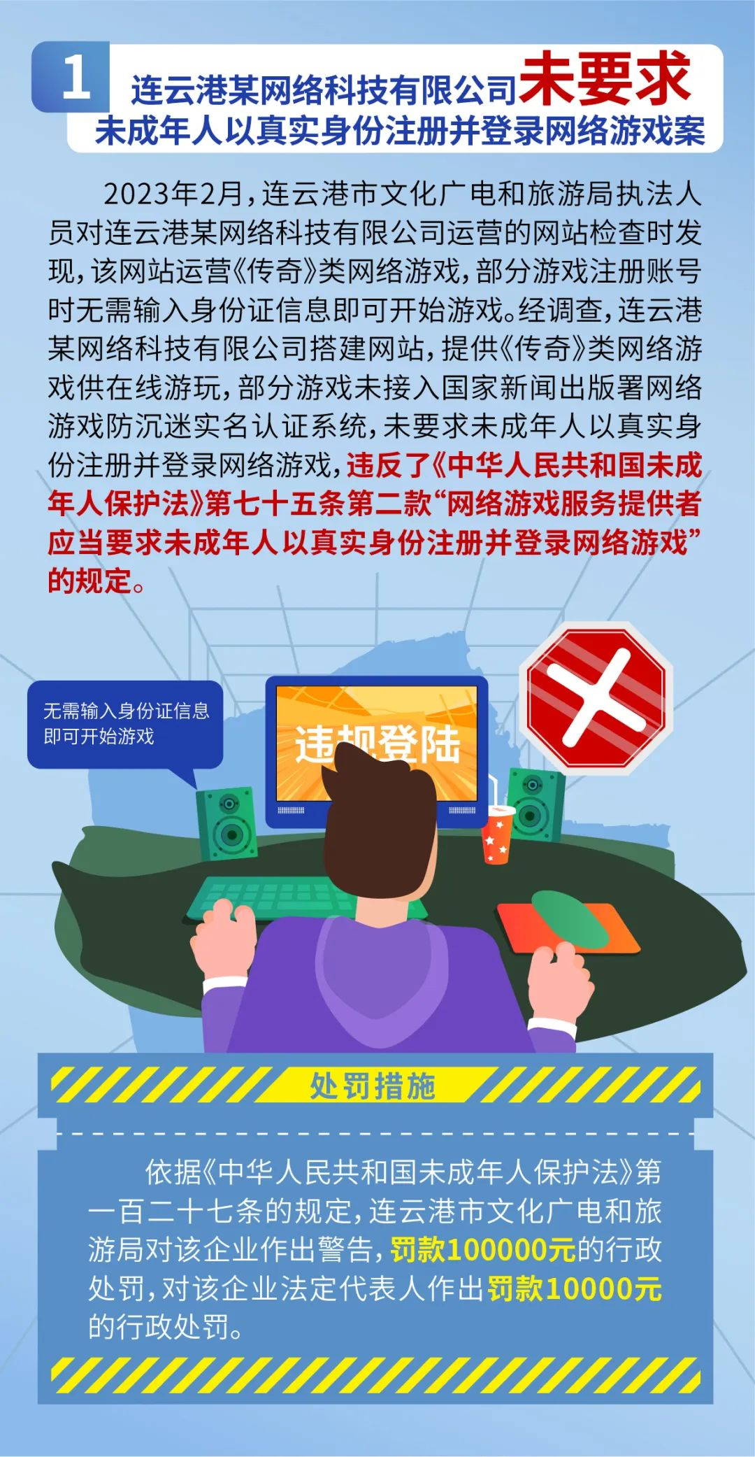 江苏省文化和旅游厅、江苏省新闻出版局日前联合公布5起涉未成年人网络游戏典型案例,包括未经批准擅自上网出版游戏、未要求未成年人以真实身份注册游戏等。以此警示网络游戏企业和网络游戏从业者引以为戒、守法经营。同时,也通过这些警示案例提醒网民,健康上网,安全“冲浪”。