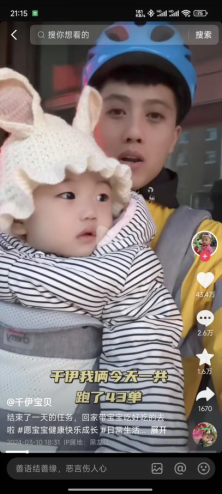 视频中抱着孩子的外卖骑手父亲“小松”正讲述着今天的故事,评论区来自叔叔阿姨的关心和高达43万的点赞使“小松”充满了“创作热情”,“小松”已经在各类平台发布了百余条短视频,个人主页中充满了“离开了妈妈”等字样。靠着发布自己和女儿一起送外卖的视频,“小松”已经在各类网络平台积累了40余万粉丝,也在直播带货中取得了收益。