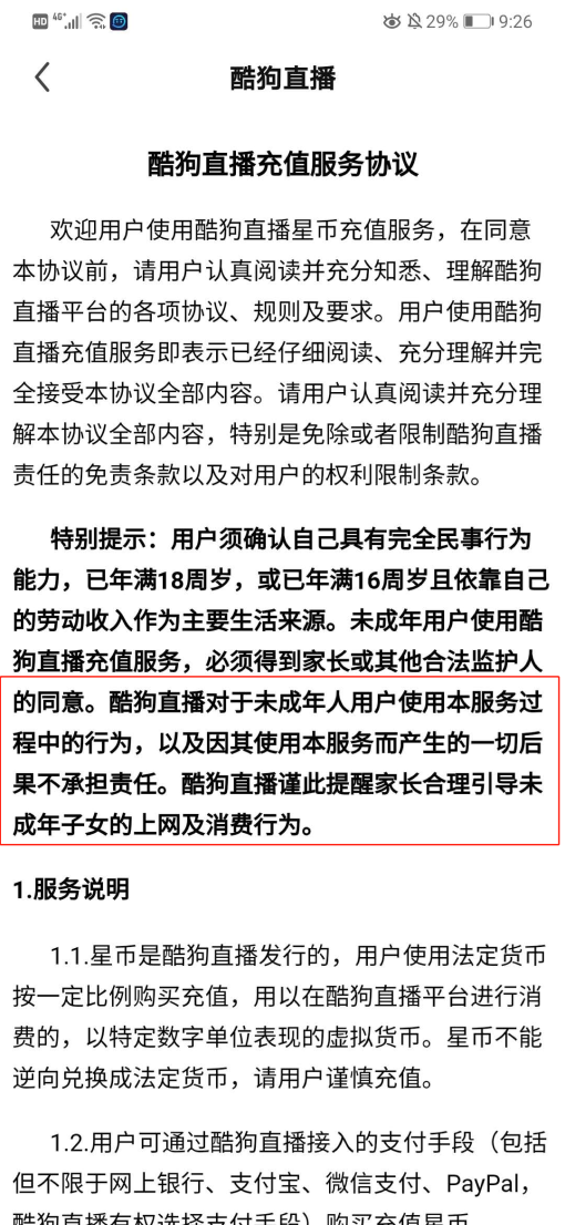 直播平台存在部分平台青少年模式未落实到位、不同型号手机同价不同币且最低充值金额不同、平台充值存在漏洞,默认勾选“小额免密支付”、诱导消费以及退费难的问题。斗鱼直播、酷狗直播在充值协议中强调“对于未成年用户使用本服务过程中的行为,以及因使用本服务产生的一切后果不承担责任”。直播打赏涉嫌消费诱导,包括但不限于单次打赏时,页面有连击提示或者自动勾选数量,主播口头交流诱导继续打赏赠送。