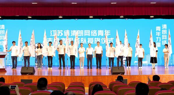 活动现场,来自全省13个设区市团委的代表共同参加了江苏省清朗网络青年志愿服务队授旗仪式。