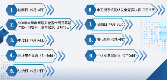 2020年9月14日到20日,我市将分别组织举办以网络安全为主题的校园日、电信日、法治日、金融日、青少年日以及个人信息保护日,将网络安全意识植根各行各业,惠及普通市民。