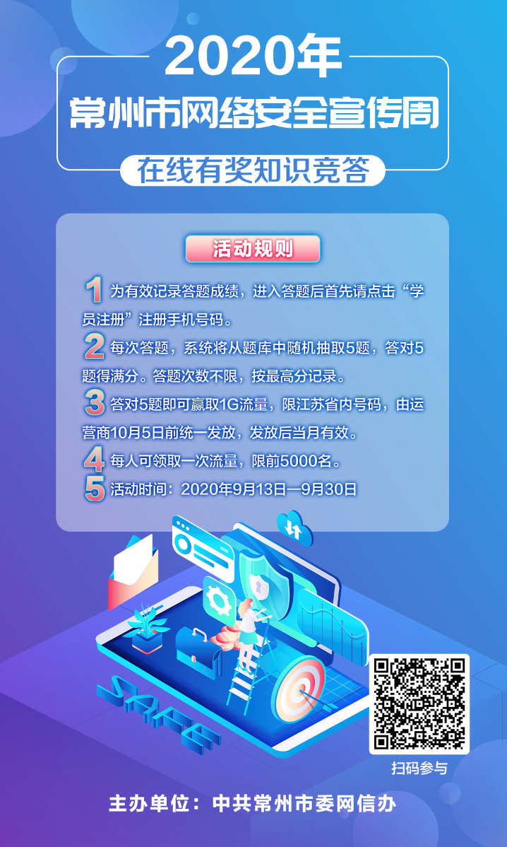 同时,9月13日起2020年常州市网络安全宣传周在线有奖知识竞答也已上线 快来扫码参与答题吧!