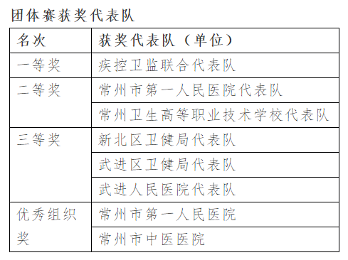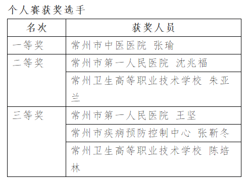 经过激烈的决赛角逐,市疾控卫监联合代表队、市第一医院代表队和市卫生高等职业技术学校代表队分获前三名;张瑜、沈兆福、朱亚兰3人荣获个人赛一、二等奖,并被授予“常州市技术能手”称号。