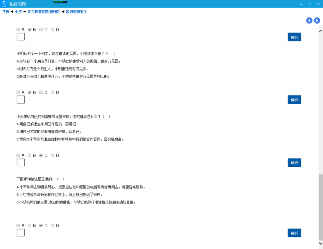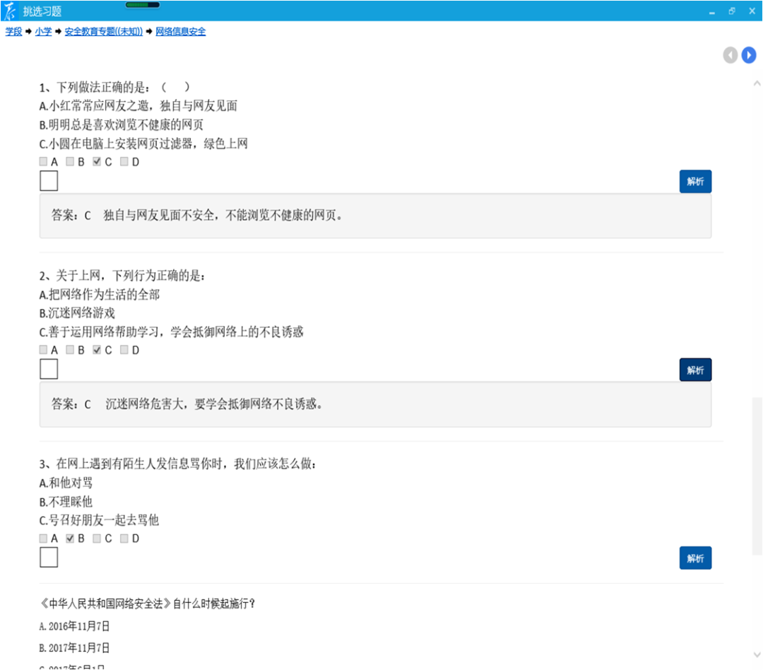每条微课还精心编制了对应的习题,供学生在线练习,各校采用主题班会、专题信息课等形式组织学生集中学习,利用“泰微课”教学圈功能推送信息,组织家长和学生共同在线学习,取得了很好的宣传教育效果。