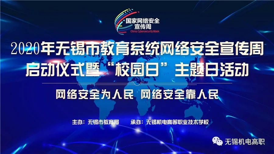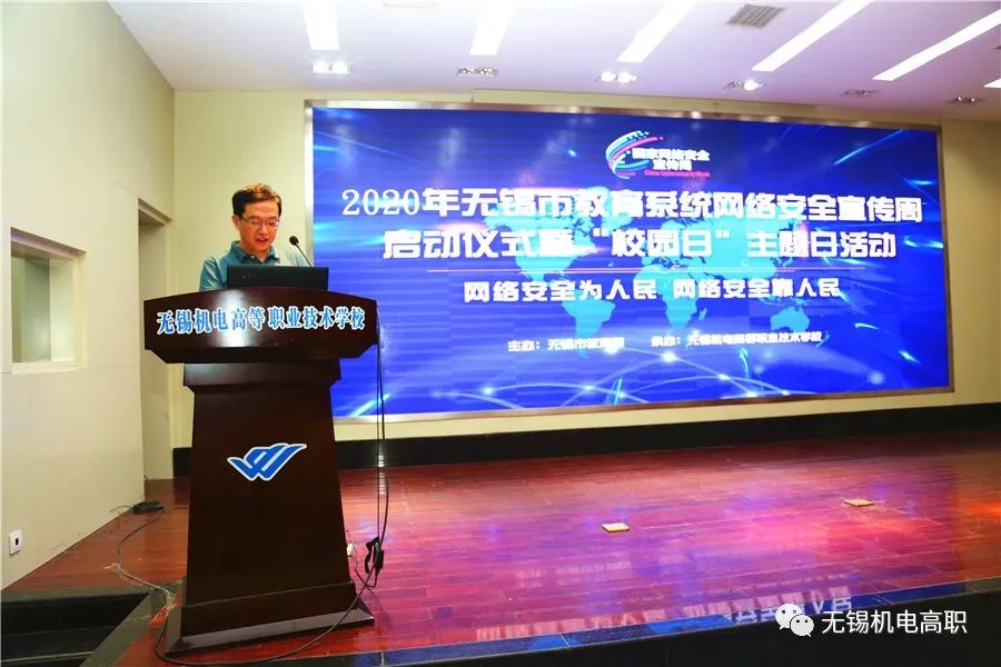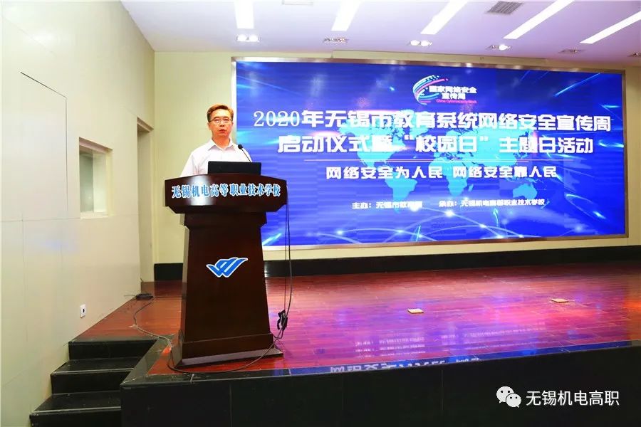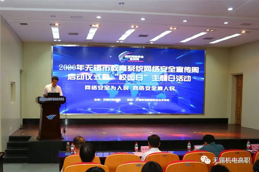 为深入学习贯彻习近平总书记关于网络强国的重要思想,提升广大师生网络安全意识和防护技能,形成健康的网络环境和良好的网络秩序,近日,2020年无锡市教育系统网络安全宣传周启动仪式暨“校园日”主题日活动在无锡机电高等职业技术学校报告厅举行。本次活动由无锡市教育局主办,无锡机电高等职业技术学校承办。市委网信办副主任鲁新龙,市教育局副局长许敏,市教育局、市公安局相关处室负责人,校方相关部门负责人,以及学生代表参加了此次活动。