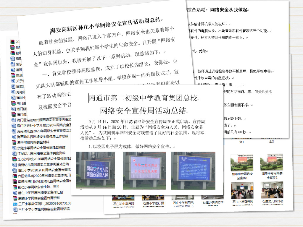 各地各校认真收集整理了活动相关素材并做好活动总结。网络安全宣传周系列活动,营造出网络安全为人民、网络安全靠人民的良好氛围,使广大师生认识到网络安全要从自身做起,真正将网络安全落到实处。今后,南通市教育系统将总结活动经验,提供更多符合各类学生需求的学习内容,寓教于乐,构筑全方位、可持续的校园网络安全教育机制,不断提高广大师生的网络安全意识和防护技能。