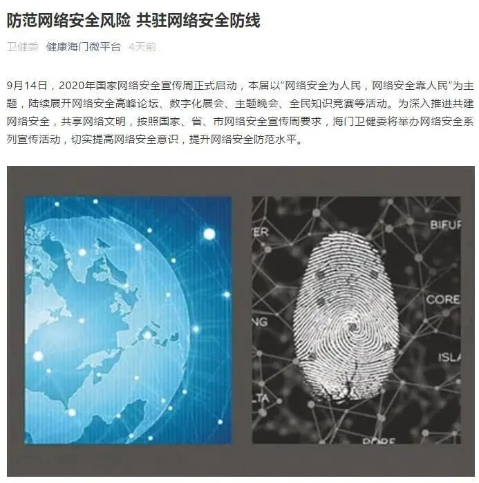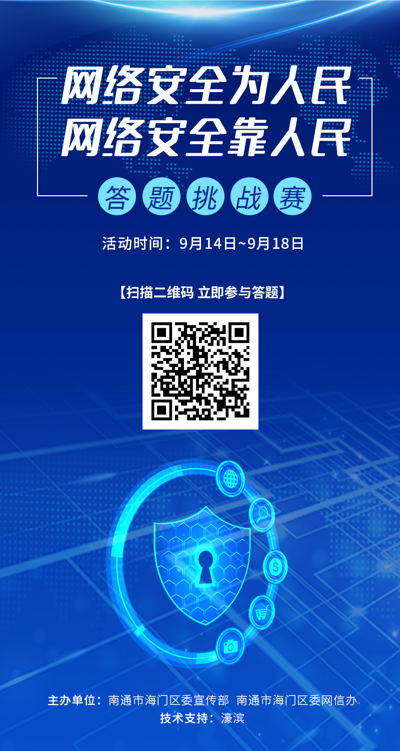 9月14日,海门区委宣传部、海门区委网信办组织推出网络安全知识有奖竞答活动。通过海门发布等20多个官方微信公众号进行推广,号召广大市民、网民参与答题抽奖活动,创新宣传形式,策划制作了H5动态网络安全宣传页面,全力营造“网络安全为人民,网络安全靠人民”的浓厚氛围。