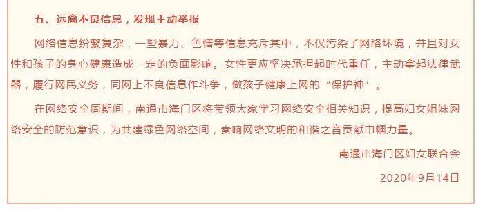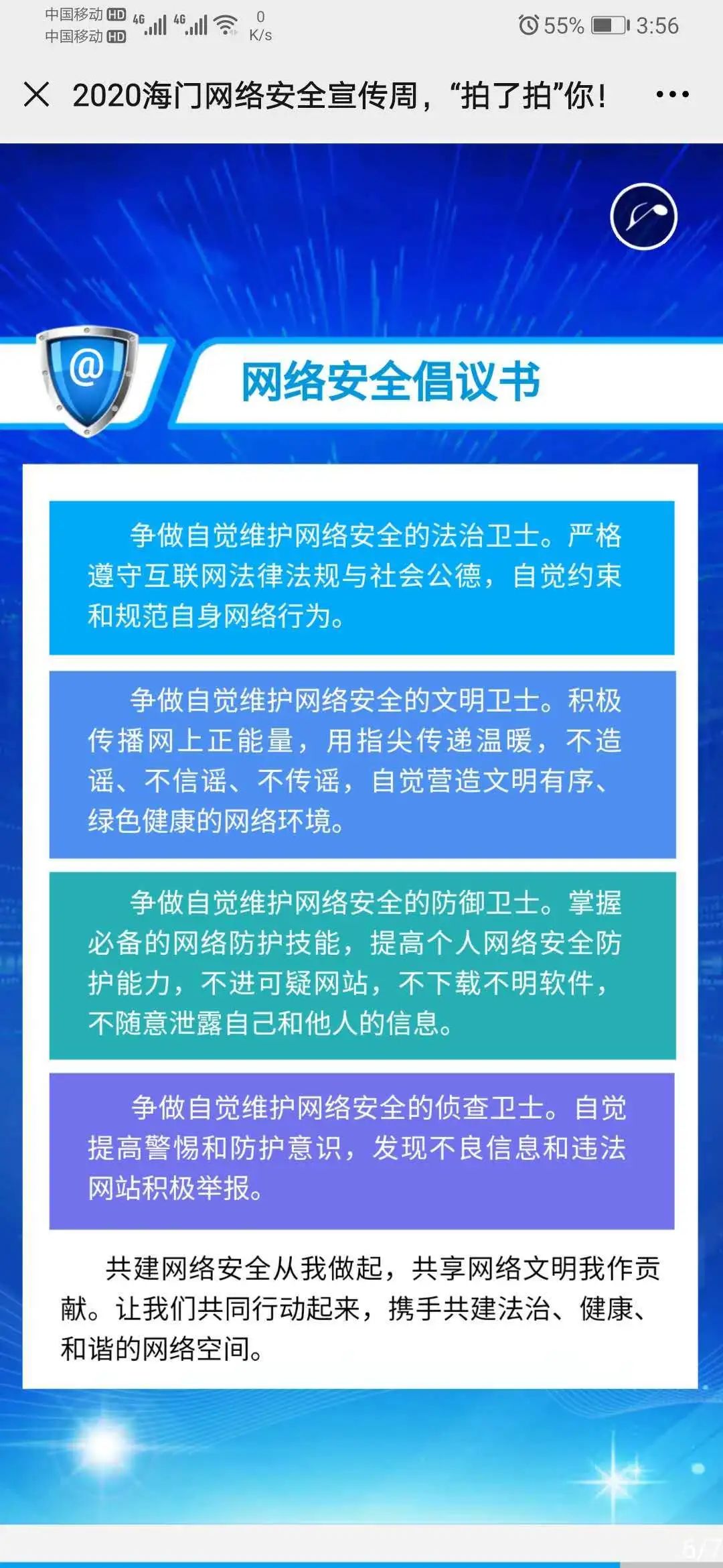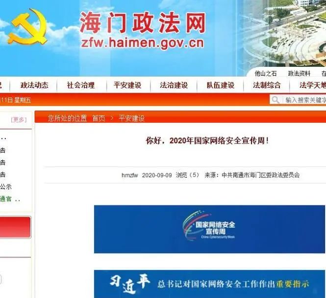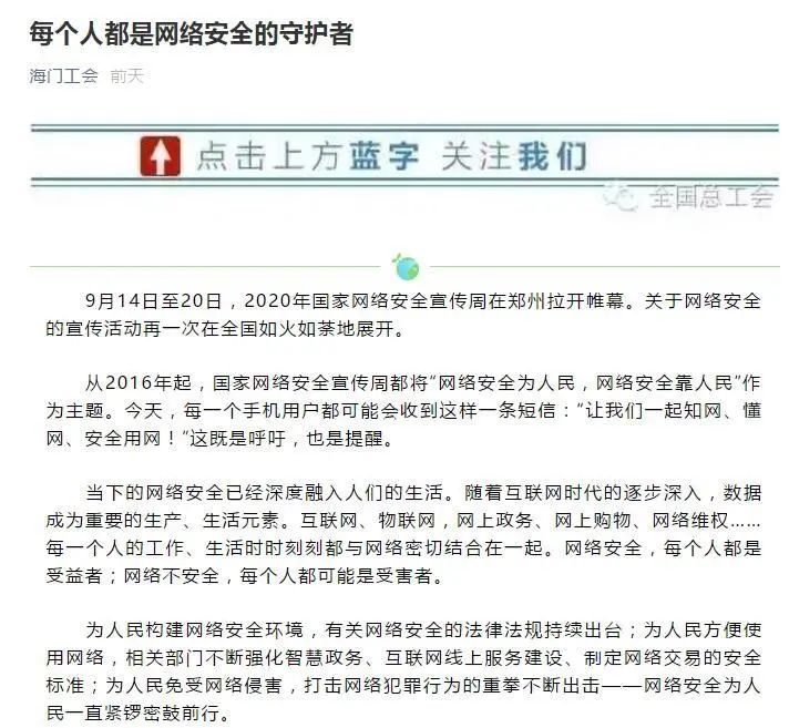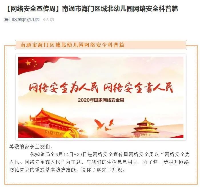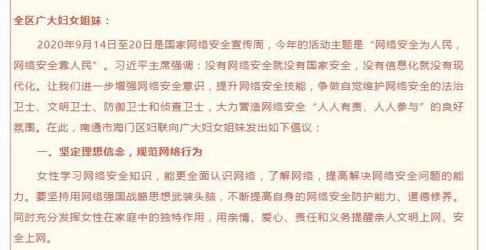 9月15日,海门区委网信办创新宣传形式,策划制作了H5动态网络安全宣传页面《2020海门网络安全宣传周,“拍了拍”你!》,联合全区自媒体矩阵群体向广大网民发出网络安全提醒,发布《网络安全倡议书》,努力培养网络安全“七种意识”,全力营造“网络安全为人民,网络安全靠人民”的浓厚氛围。