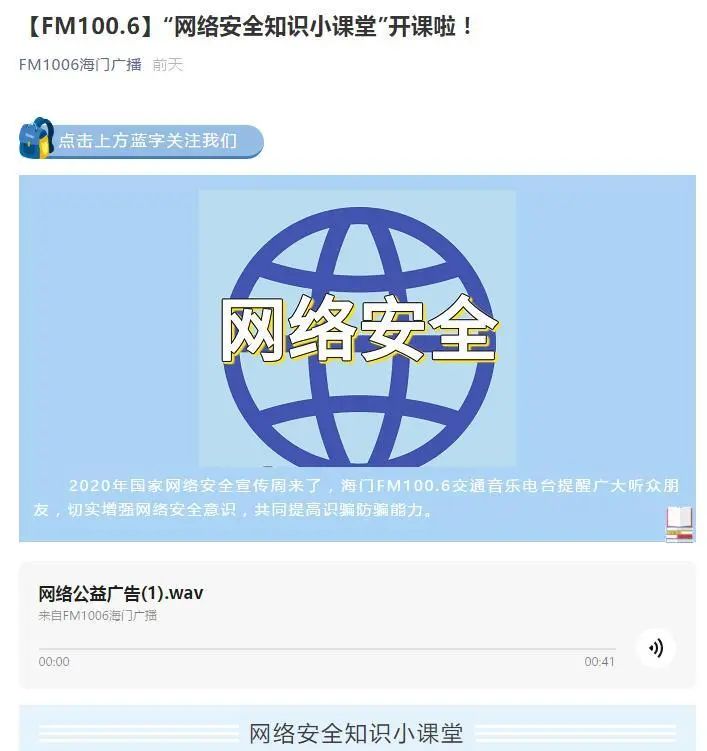 9月20日,区委网信办还将组织协调教体、公安、金融、电信等部门有关负责同志,走进广播直播室进行网络安全宣传访谈活动,将网络安全常识宣传到每位电台听众。
