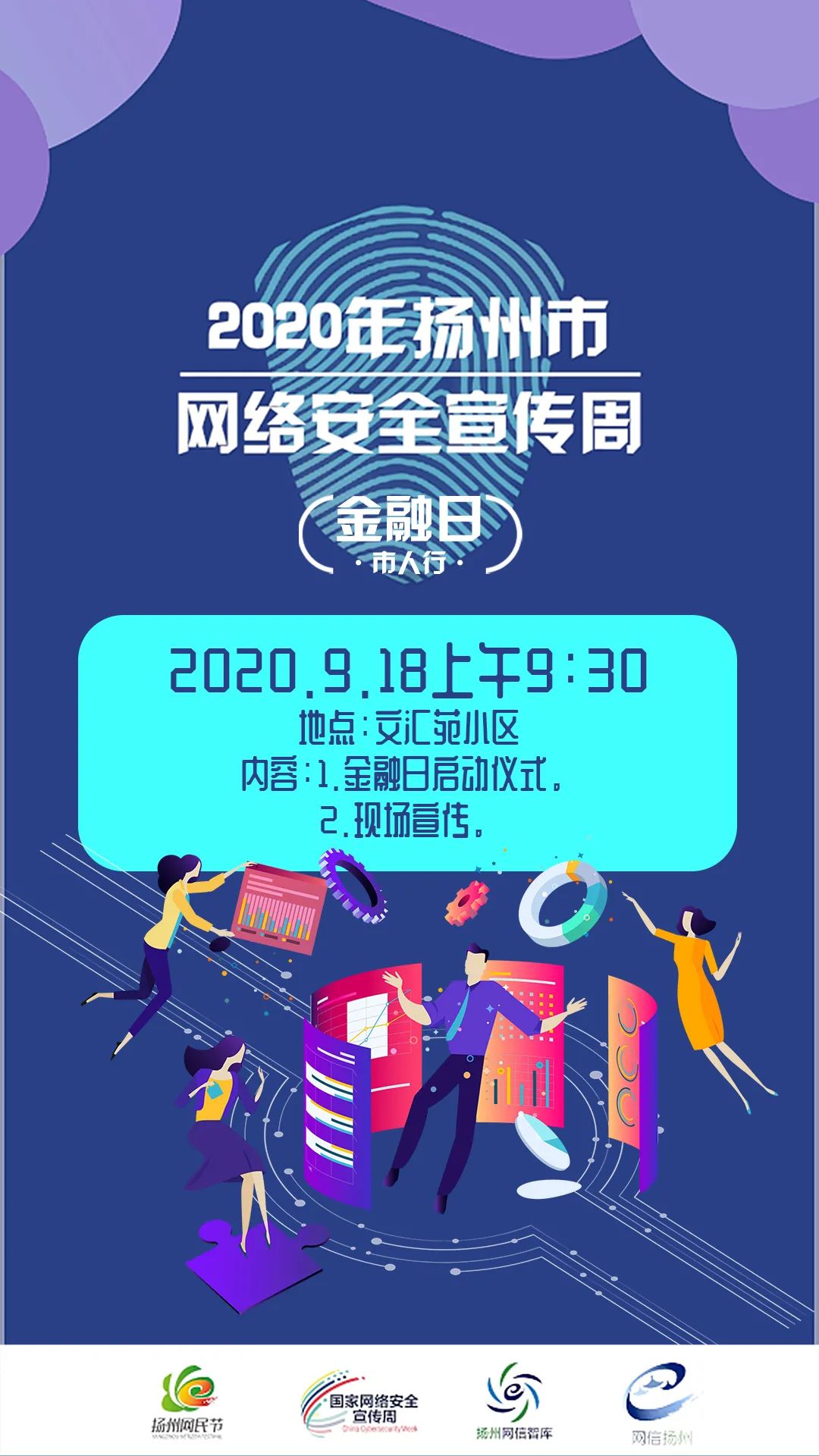 9月18日,2020年扬州市国家网络安全宣传周“金融日”集中宣传活动在文汇苑小区举行。扬州市委网信办、中国人民银行扬州市中心支行以及30家银行业机构的代表共同参加了活动。