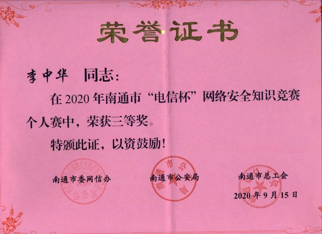 网络安全的建设需要专业人才保驾护航。中国银行南通分行长期以来高度重视员工专业能力培养,积极组织科技条线员工参加专业培训,鼓励员工参加系统内、外部各类比赛,交流经验、夯实业务能力。近期,分行积极选派业务骨干参加“2020年南通市网络安全知识竞赛”。最终,分行员工李中华凭借稳定发挥,获得个人第四名、竞赛三等奖的好成绩。