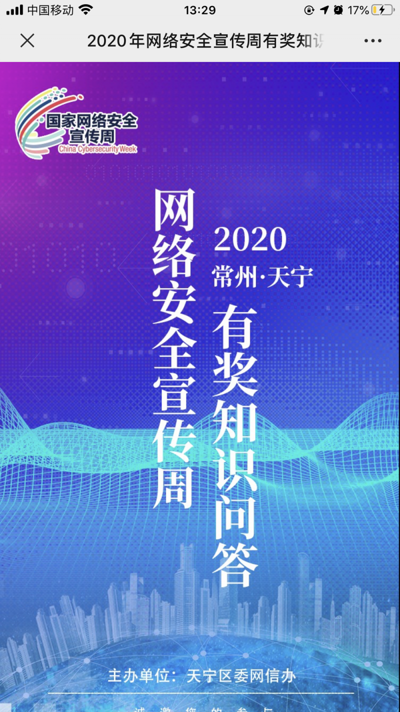 在“锦绣天宁”微信公众号开设“2020年天宁区网络安全宣传周”专栏,面向全社会开展网络安全在线有奖竞答活动。