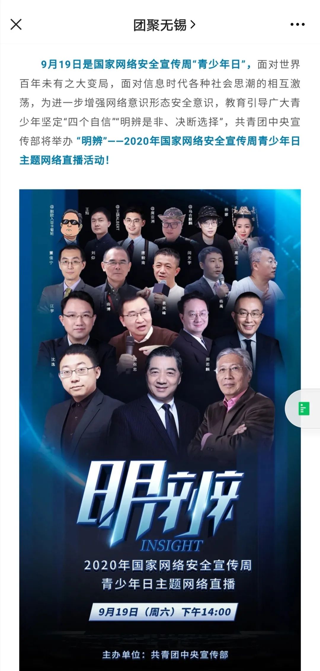 活动当天,无锡团市委在“团聚无锡”官方微信上发布网络安全宣传周“青少年日”主题宣传微刊,利用新媒体发挥团组织引领带动作用,积极在线上开展网络安全宣传。