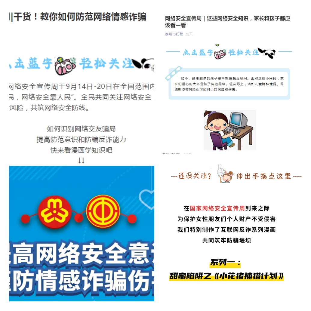 为进一步增强广大妇女群众网络安全意识,提高自我防范能力,营造“网络安全人人有责、人人参与”的良好社会氛围,泰州市妇联与市总工会协同联动,组织开展了一系列宣传活动。
