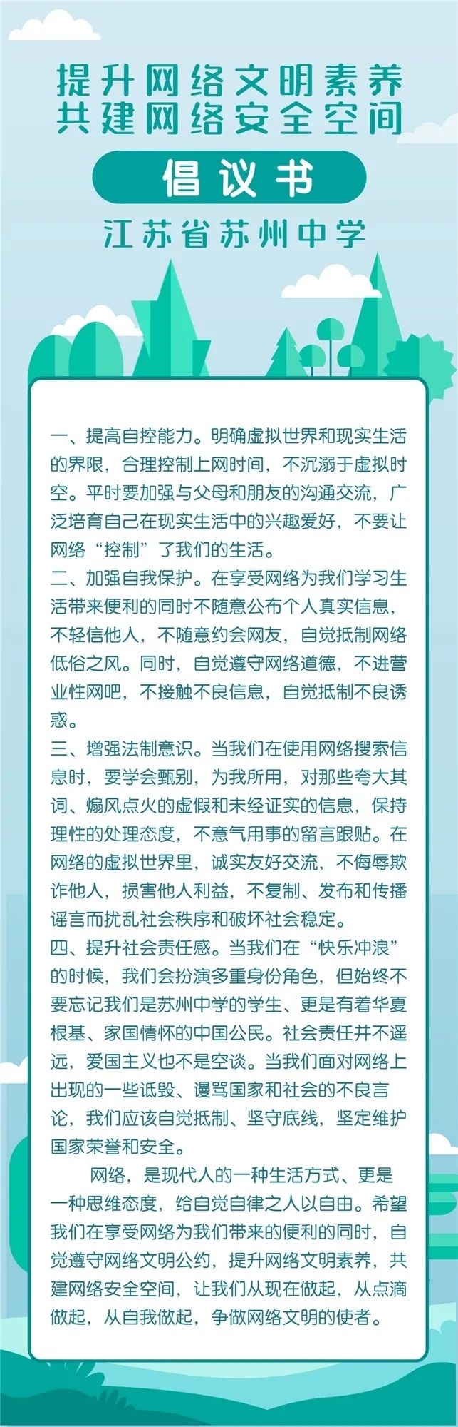 第七个国家网络安全宣传周于2020年9月14-20日在全国范围内开展,网络安全为人民,网络安全靠人民,苏州中学举办了“提升网络文明素养,共建网络安全空间”为主题的系列活动。全校师生积极响应倡议号召,立志做文明的“冲浪少年”。