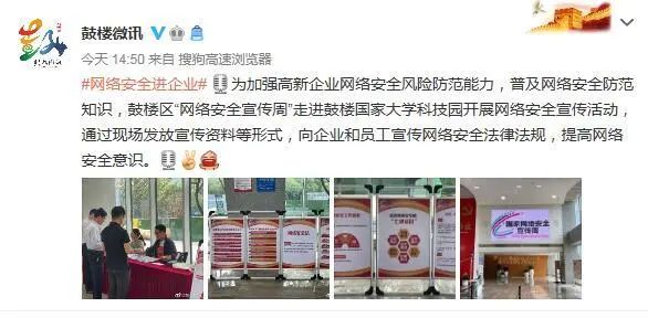 在南京鼓楼国家大学科技园开展网络安全宣传活动,向企业员工宣传网络安全法律法规,提高网络安全意识。