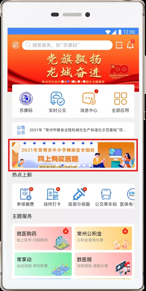 步骤一:学生登入“我的常州”APP,点击首页滚动图参与答题;