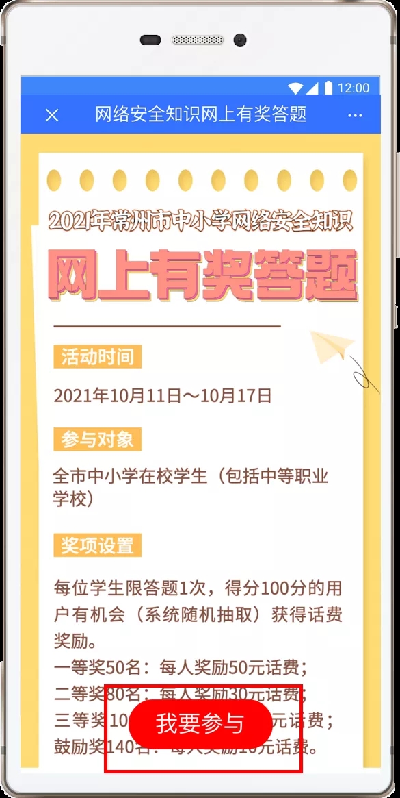 步骤三:学生每人限答题1次,凡参与答题且获得满分的学生,均有机会(系统随机抽取)获得话费奖励。