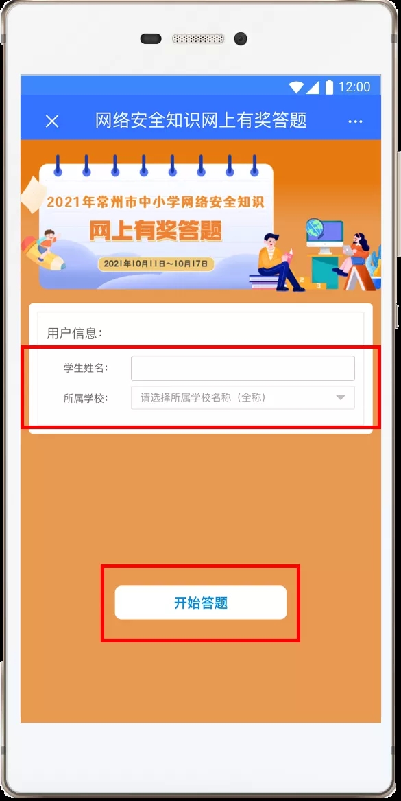步骤二:答题前,需填写学生姓名,选择学生所在学校。知识竞答共20题,总分100分;