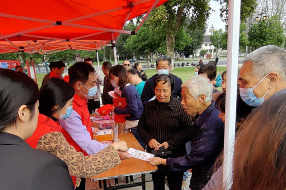 在启动仪式现场,志愿者向群众宣传网络安全知识。陈星宇摄