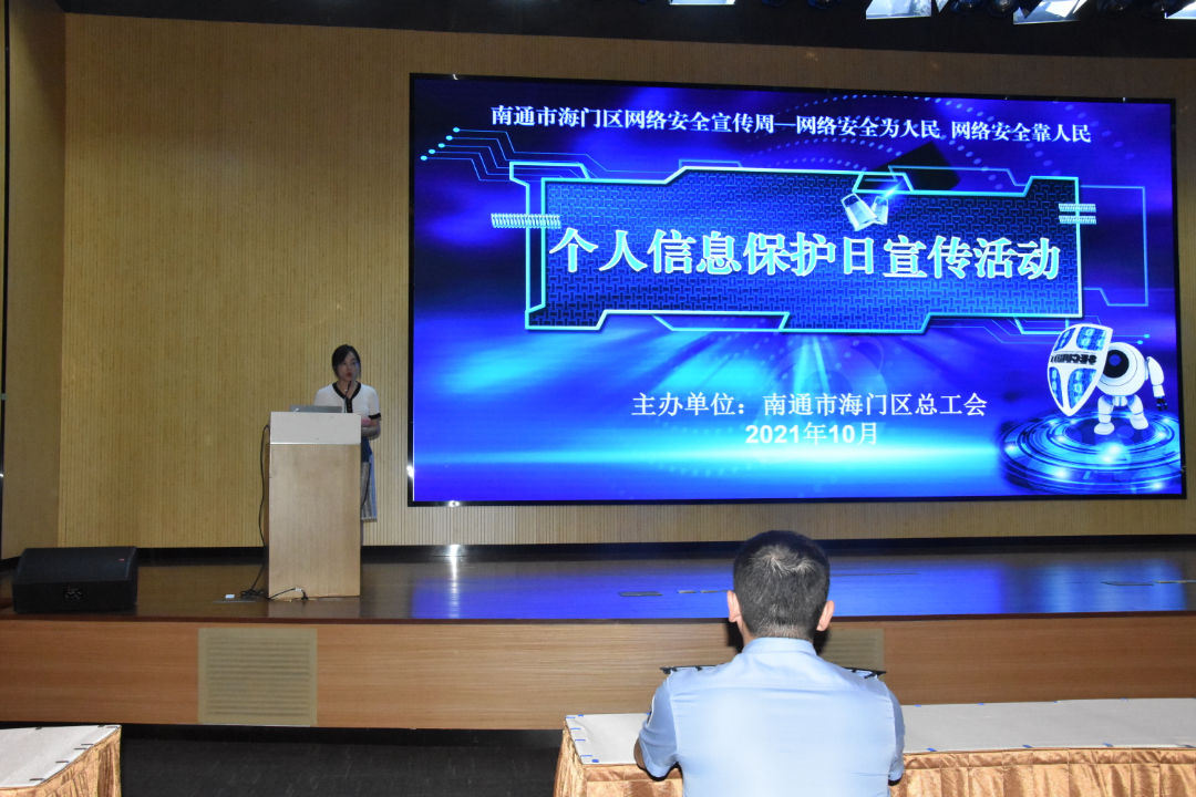 10月15日,南通海门区总工会“个人信息保护日”主题讲座、有奖竞答系列活动在临江新区生物医药产业园举行。海门区委网信办专职副主任邹国童,区总工会党组副书记杨慰华,临江新区党工委副书记沙哲出席活动。