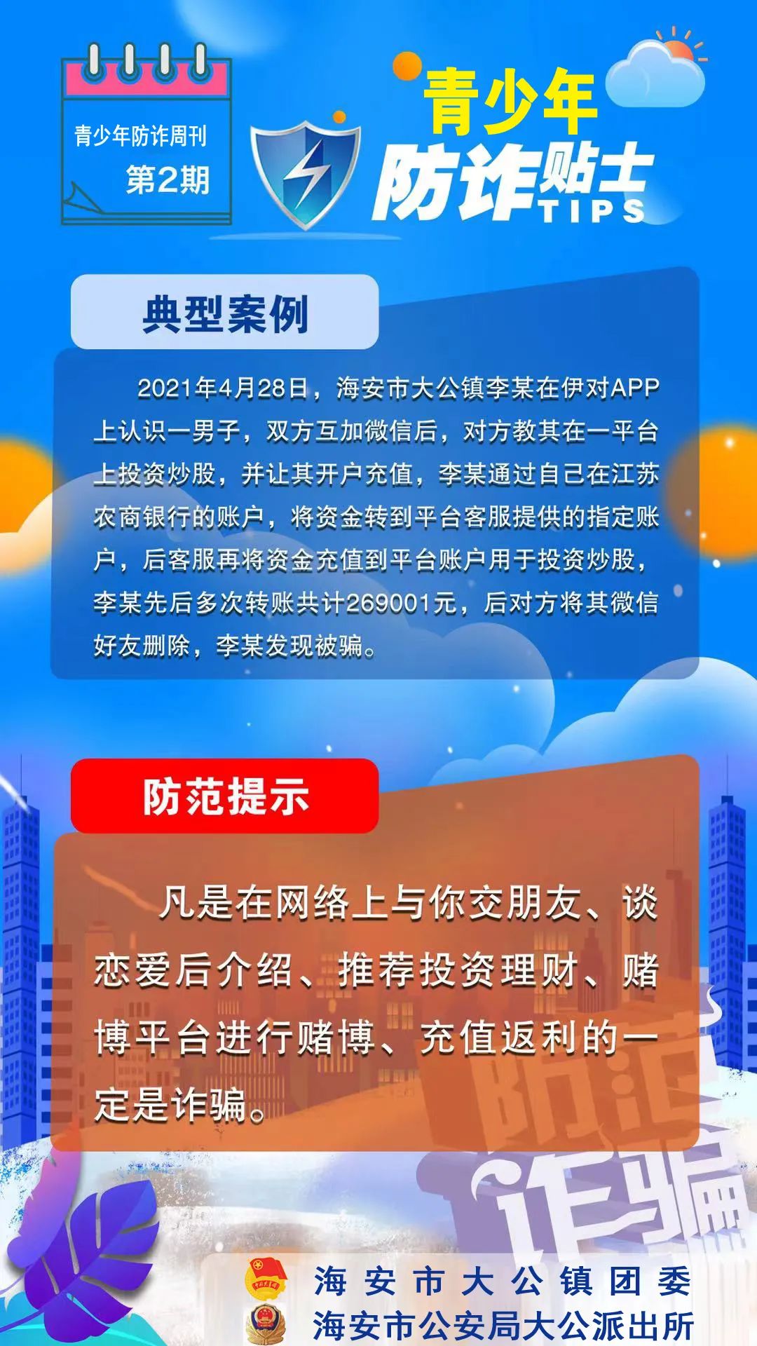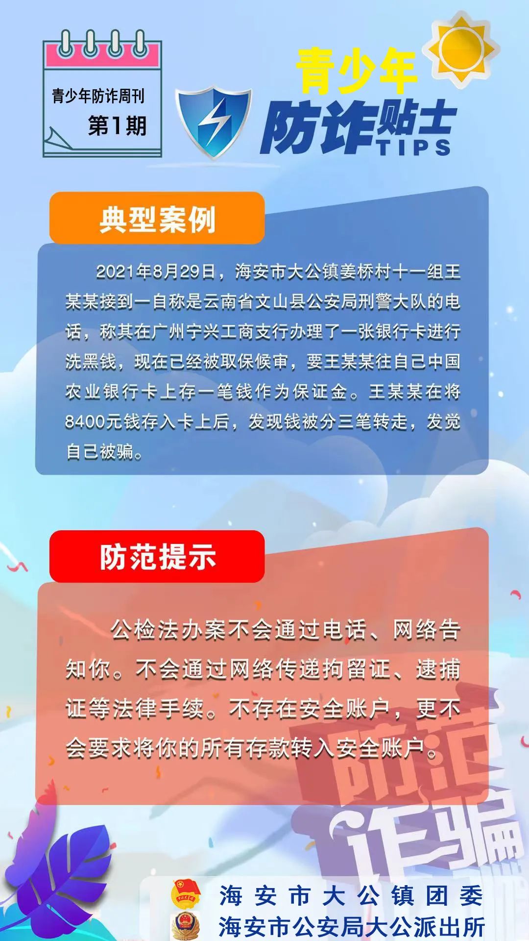 为进一步增强青少年的网络安全意识和安全防护技能,海安市大公镇团委联合派出所积极探索新型宣传模式,依托微信公众号、抖音等青少年群体关注的媒体平台,推出“防诈小贴士”周刊,用身边的典型案例,点破诈骗手法,发布预警提示。增强青少年防范网络诈骗能力,助推全镇广大青少年健康成长。目前已推出2期。