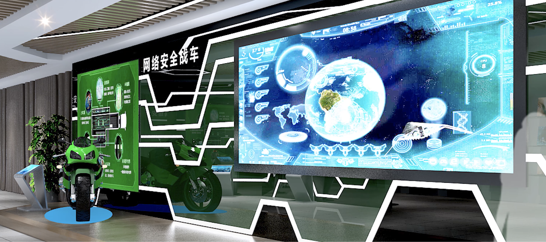 青少年网络安全科普室内科技感极强,运用现代化技术手段全方面展示中国网络安全发展历程等内容,将网络强国的种子深播青少年心间。科普室还设有网络安全战车等以网络攻击防御为内容的定制开发游戏,让青少年在游戏中学习,在游戏中体验。