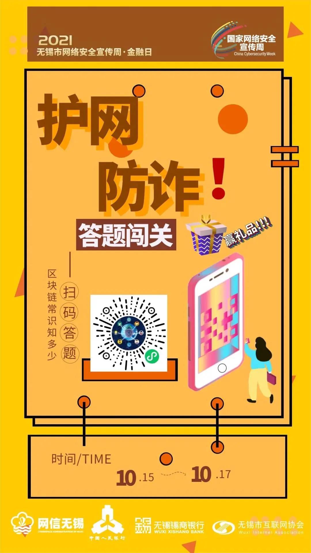 为营造区块链健康发展的良好氛围,推动网络安全知识学习教育深入群众、深入基层、深入人心,金融日主题日当天,由中国人民银行无锡市中心支行推出的“护网防诈”答题闯关挑战赛正式启动,当天还上线了“护网防诈”答题闯关小程序,创新理论学习方式丰富网络安全知识学习载体宣传普及网络安全知识技能进一步提高您的网络安全防范意识。