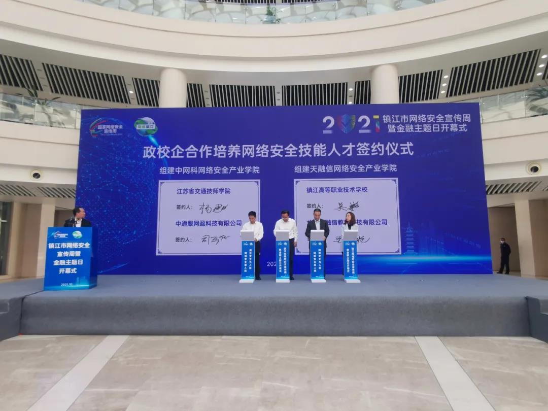 开幕式上还举行了组建2个网络安全产业学院、政校企合力培养网络安全技能人才签约仪式,分别为:江苏省交通技师学院与中通服网盈科技有限公司共建“中网科网络安全产业学院”;北京天融信教育科技有限公司与镇江高等职业技术学校共建“天融信网络安全产业学院”。