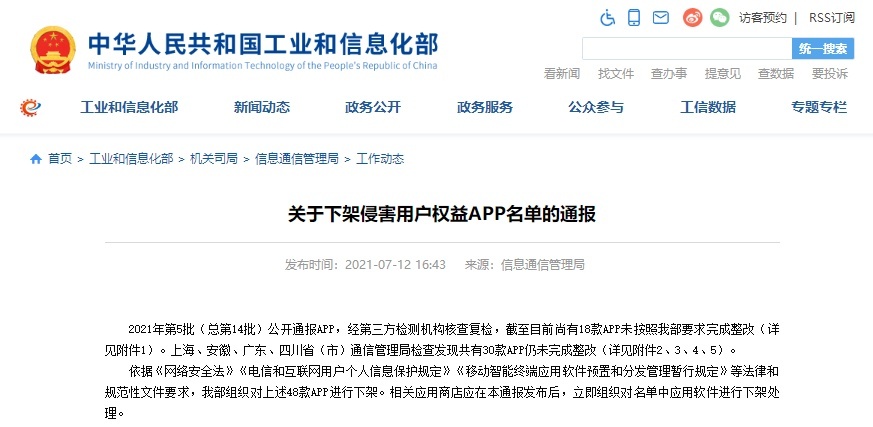 依据《网络安全法》《电信和互联网用户个人信息保护规定》《移动智能终端应用软件预置和分发管理暂行规定》等法律和规范性文件要求,工业和信息化部组织对上述48款APP进行下架。相关应用商店应在本通报发布后,立即组织对名单中应用软件进行下架处理。