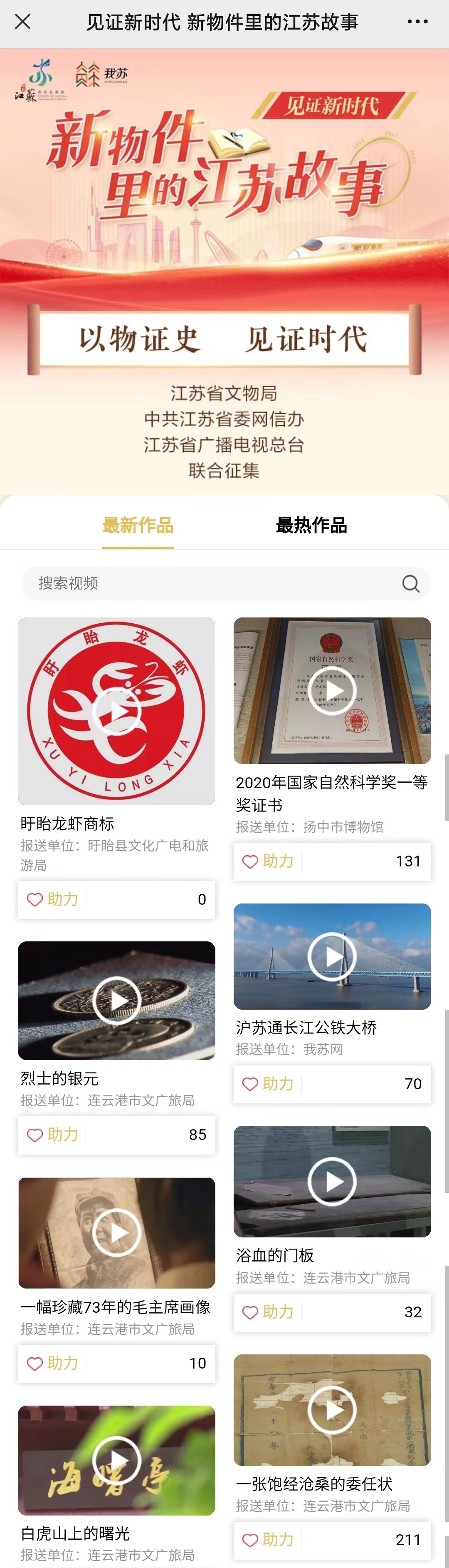 活动在我苏客户端搭建“见证新时代——新物件里的江苏故事”主题活动全省总平台页面,集中展示候选相关实物影音资料,并接受网络投票。各县级融媒体中心在所属新媒体平台开设分平台展示页面(点击下方图片进入活动页面)。