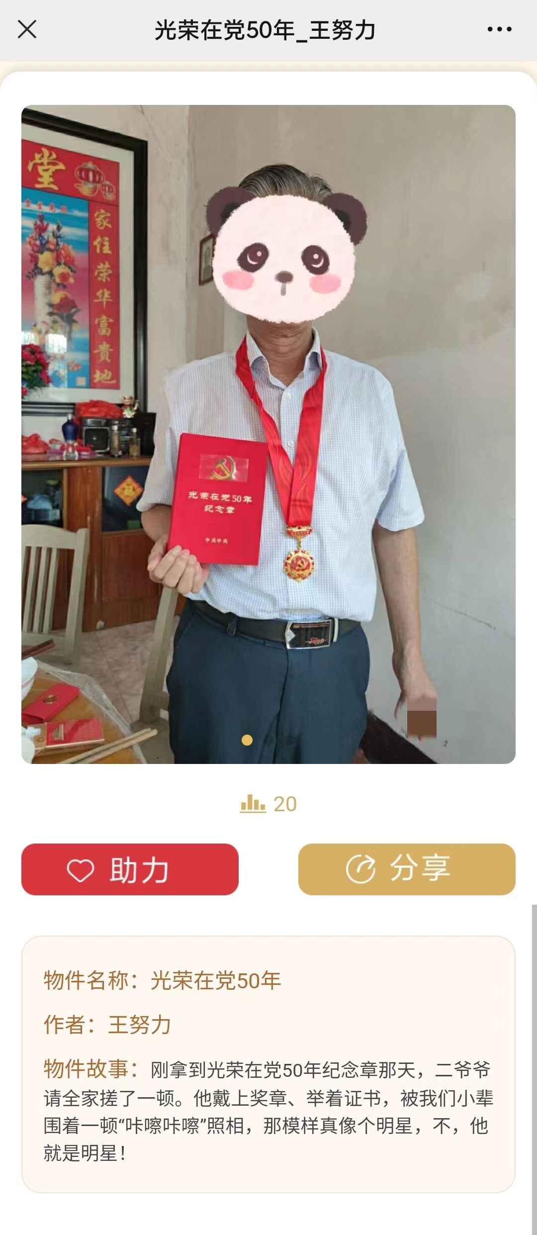 有网友晒出了家中长辈的“光荣在党50年”纪念章,“刚拿到那天,二爷爷请全家搓了一顿。他戴上奖章、举着证书,被我们小辈围着一顿‘咔嚓’(照相),那模样真像个明星,不,他就是明星!”;