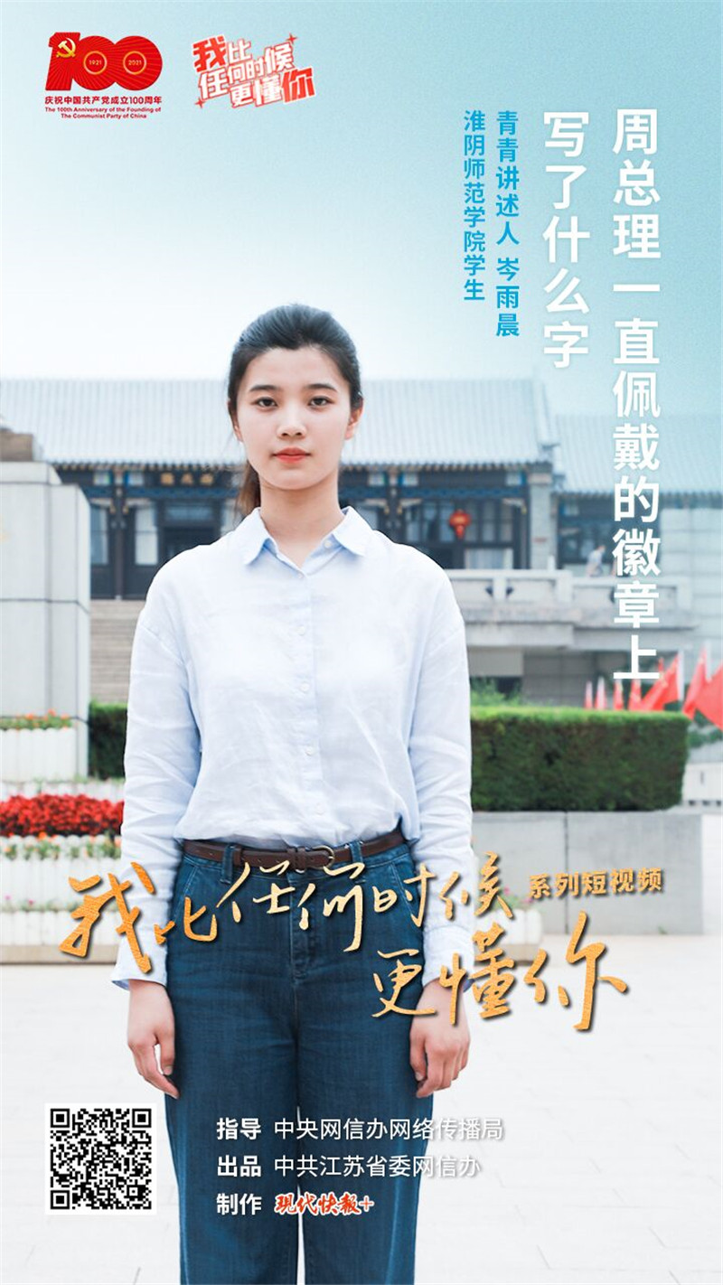 8月16日,“我比任何时候更懂你”系列短视频第23集《周总理一直佩戴的徽章上写了什么字》上线。本集青青讲述人是淮阴师范学院学生岑雨晨。