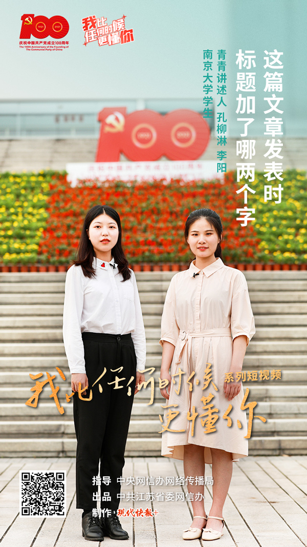 8月18日,“我比任何时候更懂你”系列短视频第25集《这篇文章发表时标题加了哪两个字?》上线,本集青青讲述人是南京大学学生孔柳淋、李阳,两人都是马克思主义学院的学生。