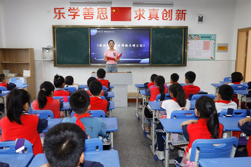 “线上新知勤学习,数字素养长提升;网络安全靠你我,共筑清朗好环境!”9月14日,江苏泰州的靖江市斜桥镇中心小学内,响起朗朗童声,泰州市网络安全宣传大使赵慧带领大家齐诵《新时代青少年网络文明公约》,并向同学们讲解网络安全知识。