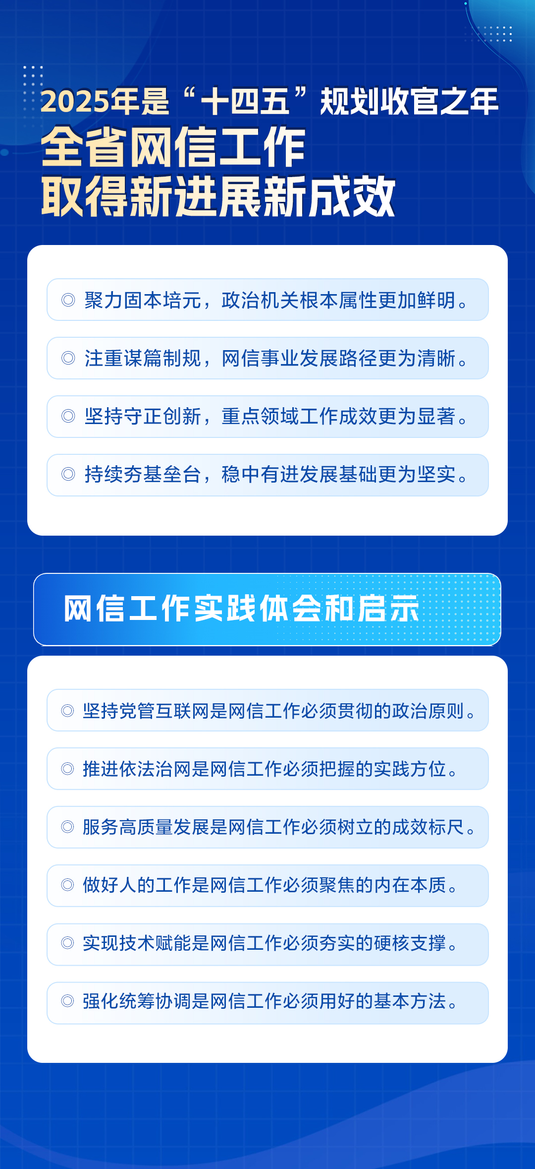 会议提出,谋划和推进网信工作,首先要读懂时代赋予的新考题。面对“变局加速演进、变革加速突破”的时代大势,网信领域作为大国博弈战略承压前端的作用更加凸显。面对“现代化建设、信息化先行”的历史契机,网信事业作为赋能高质量发展先导力量的作用更加凸显。面对“走在前、做示范”的重大任务,网络强省建设对中国式现代化江苏新实践的服务支撑作用更加凸显。面对“关键阶段、开局起步”的特殊要求,网信工作精准破题、落子定位对“十五五”发展全局的基础性作用更加凸显。