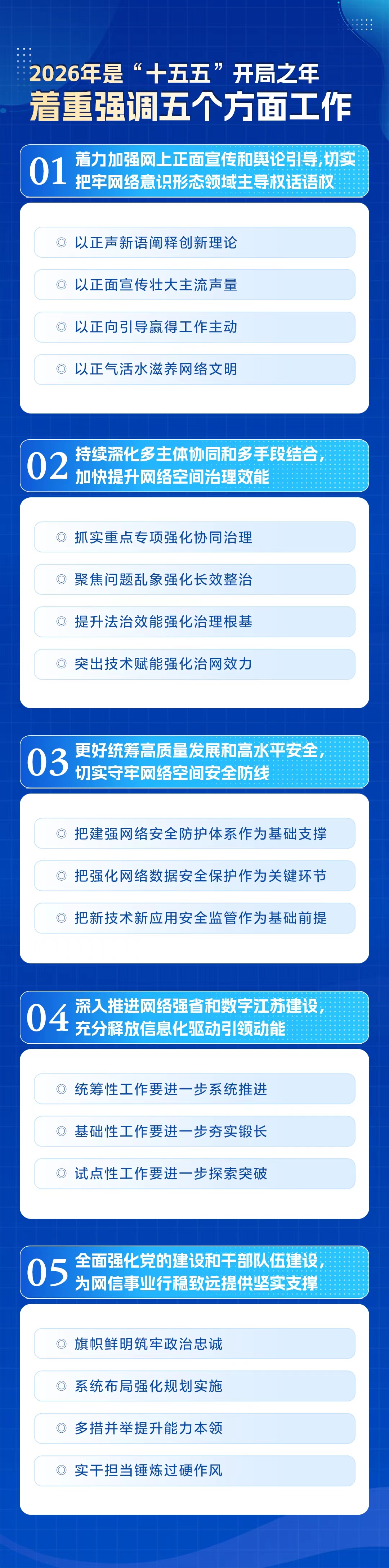 会议强调,2026年是“十五五”开局之年。做好今年的网络安全和信息化工作,必须坚持以习近平新时代中国特色社会主义思想为指导,全面贯彻落实党的二十大和二十届历次全会精神,深入学习贯彻习近平文化思想、习近平总书记关于网络强国的重要思想,深入学习贯彻习近平总书记在中央政治局第二十三次集体学习时的重要讲话精神,全面贯彻落实习近平总书记对江苏工作重要讲话精神,深刻领悟“两个确立”的决定性意义,增强“四个意识”、坚定“四个自信”、做到“两个维护”,坚持高站位谋划、高效能统筹、高标准落实,全面做好网络安全和信息化工作,以网络强省建设新成效为实施“十五五”规划开好局、起好步,奋力谱写“强富美高”新江苏现代化建设新篇章提供有力服务、支撑和保障。