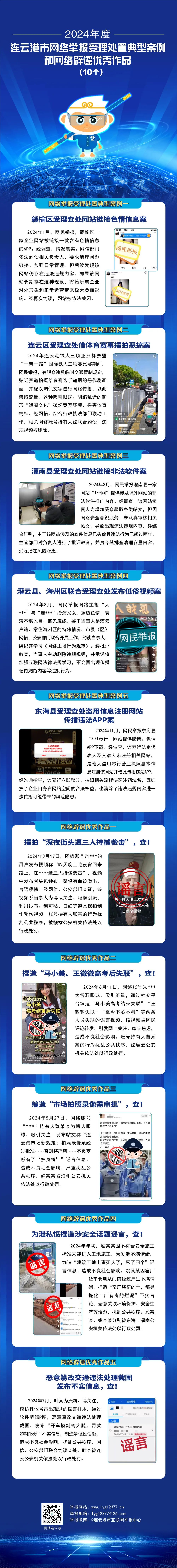 为宣传展示连云港市网络举报工作成效,提高共同治理网络谣言水平,进一步扩大网络举报工作社会影响力,连云港市委网信办近期组织开展了“2024年度全市网络举报受理处置典型案例”“2024年度全市网络辟谣优秀作品”征集评选活动,现将评选结果公布如下。