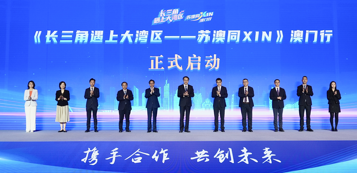 江苏省人民政府副省长赵岩,中央政府驻澳门联络办公室宣文部部长万速成,江苏省人民政府副秘书长徐华勤,江苏省委宣传部副部长、省委网信办主任杨力群,江苏省商务厅厅长司勇,江苏省港澳办副主任沈雁飞,澳门江苏社团总会会长何嘉慈,澳门新媒体联盟主席、澳门商报社长朱海生,江苏省广播电视总台副台长、集团副总经理季建南,澳广视中文新闻及资讯节目部总监刘婧,澳门莲花卫视副台长李虹祎出席当天活动并启动《长三角遇上大湾区 ——苏澳同 XIN》澳门行活动。