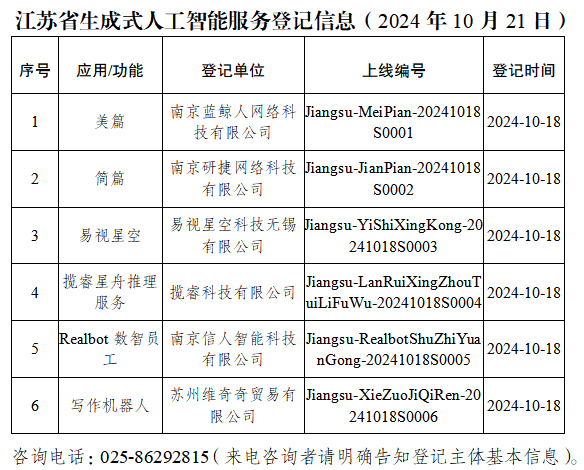 ◆ 江苏省生成式人工智能服务已备案信息公告(10月12日)