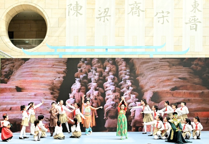 发布仪式在南京市金陵河西学校小学部带来的创意表演《文博奇妙Show》中拉开帷幕。青瓷俑翩翩起舞,瓦当纹样在光影中流转,生动展现了文物的当代活力。