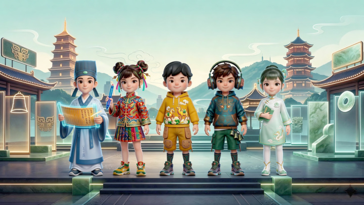 活动中,“寻宝家族”闪亮登场。由“金、玉、锦、陶、简”五种传统文物材质化身的AI小人传小简、造小锦、乐小陶、行小玉和声小金领衔登场,揭晓了2026年“拥抱文博”五大重点项目。