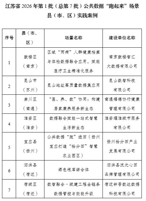 1月30日,江苏省数据局正式发布2026年第一批公共数据“跑起来”场景县(市、区)实践案例。