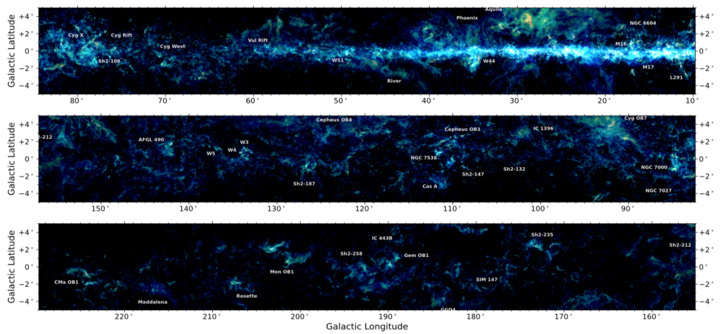 银河画卷C18O、13CO和12CO(1—0)数据合成的红、绿、蓝三色图。图中标识了著名的恒星形成区或气体结构。不同密度环境下的大尺度气体结构和形态各异的分子云细节清晰可见。