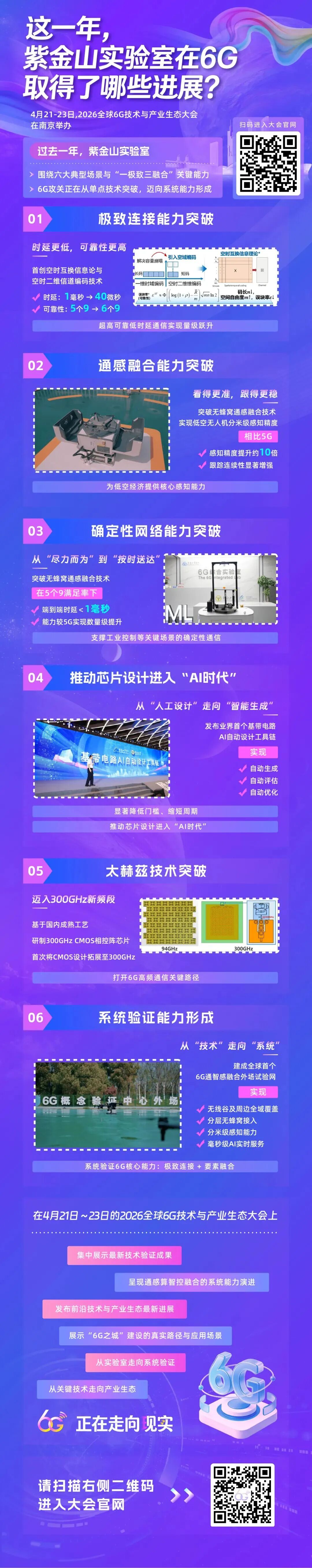 4月21日至23日,2026全球6G技术与产业生态大会将在南京举办。本次大会由紫金山实验室、未来移动通信论坛联合主办,以“极致连接・智能融合・场景共创・产业共赢”为主题,聚力推动6G技术从实验室研发全面走向规模化产业生态。