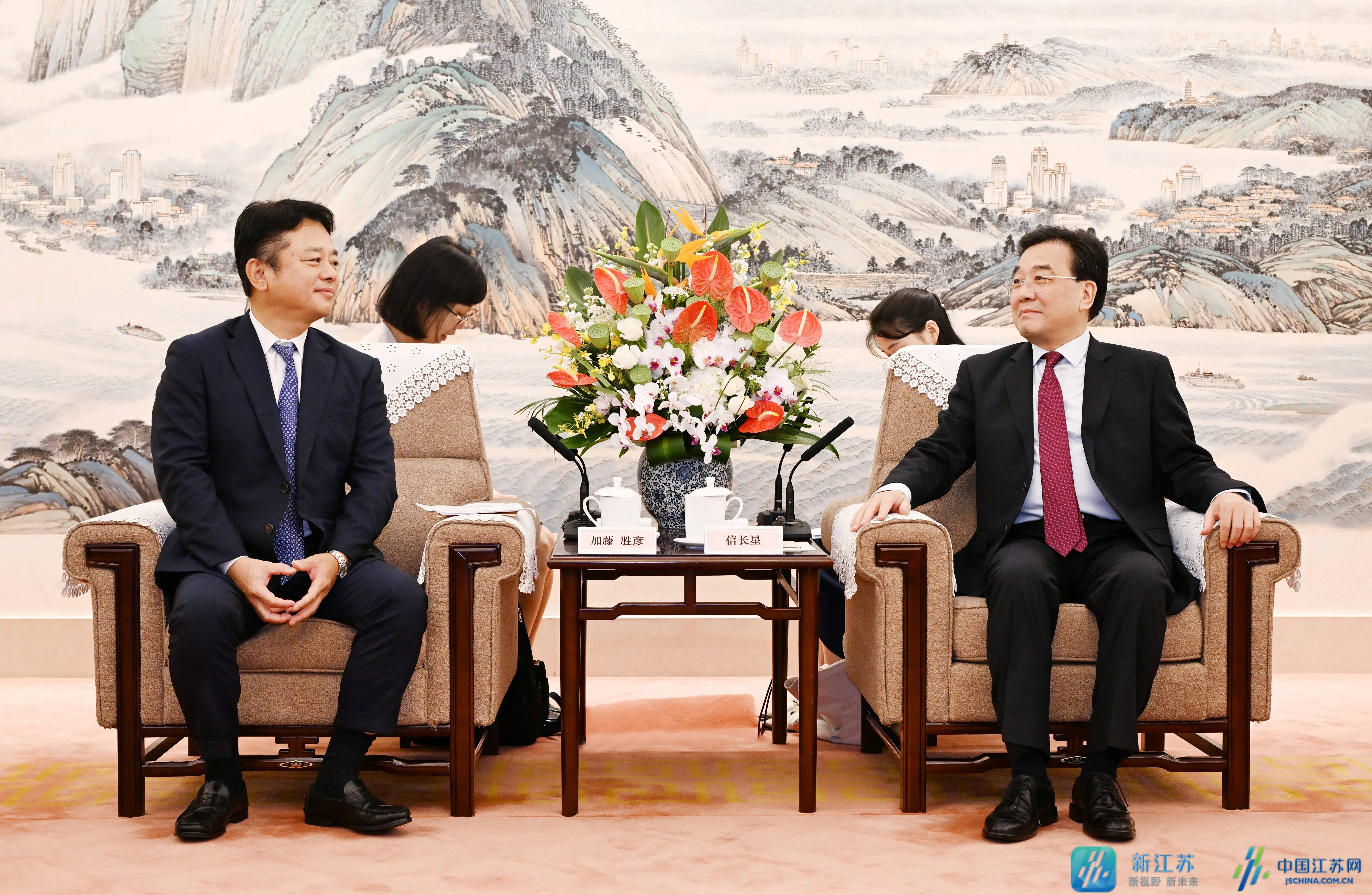 信长星对加藤胜彦一行来江苏考察访问、深化合作表示欢迎。他说,今年6月,江苏省代表团访问日本取得丰硕成果,瑞穗银行给予了大力支持。时隔两个多月,与加藤行长再次会面,感到非常高兴。中共二十届三中全会对进一步全面深化改革、推进中国式现代化作出系统部署,许多改革举措都将为外资企业、外资银行带来新的利好和机遇。江苏在推进中国式现代化中肩负着“走在前、做示范”的重大使命,我们正在着力打造具有世界聚合力的双向开放枢纽,加快成为发展新质生产力的重要阵地,推动高质量发展继续走在前列,未来发展空间和潜力巨大。瑞穗银行多年来深耕中国、深耕江苏,把江苏作为“首要战略投资地”,很有长远眼光。希望瑞穗银行继续发挥好桥梁纽带作用,以专业化的国际金融服务,助力江苏企业更好“走出去”,带动更多日资企业到江苏投资兴业。我们将以更大力度深化改革扩大开放,为瑞穗银行发展提供优质服务,不断拓展双方合作广度和深度。