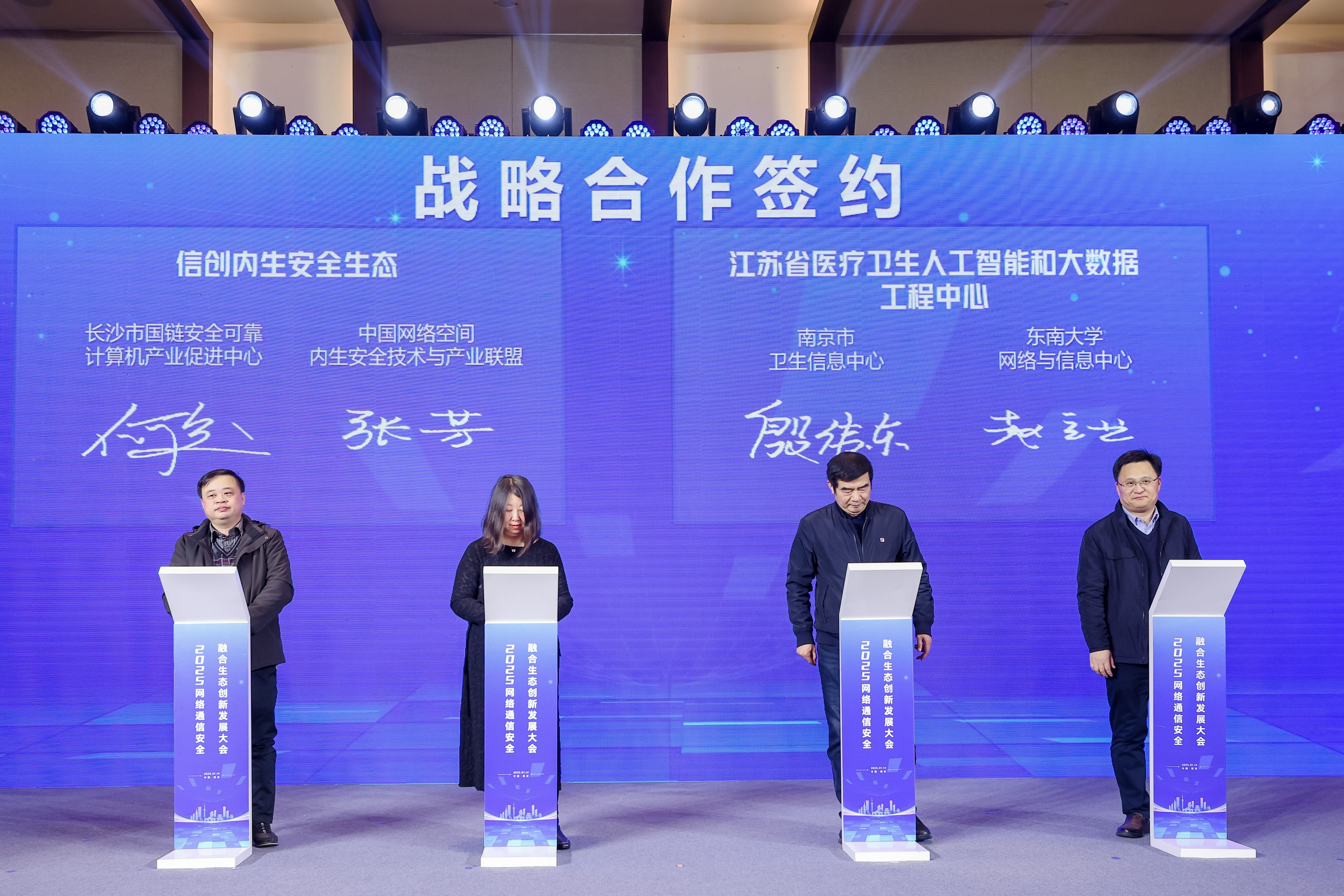 大会现场,中国网络空间内生安全技术与产业联盟、长沙市国链安全可靠计算机产业促进中心、国家网络与信息系统安全产品质量检验检测中心、国家工业信息安全发展研究中心检查评估所、南京市卫生信息中心、东南大学网络与信息中心、东南大学网络空间安全学院等单位在会上签约,共建两个中心、一个联合实验室、一个生态圈,立足产业培育、行业应用、检测检验等融合生态创新发展平台建设,携手促进网络通信安全产业生态高效协同与健康发展。
