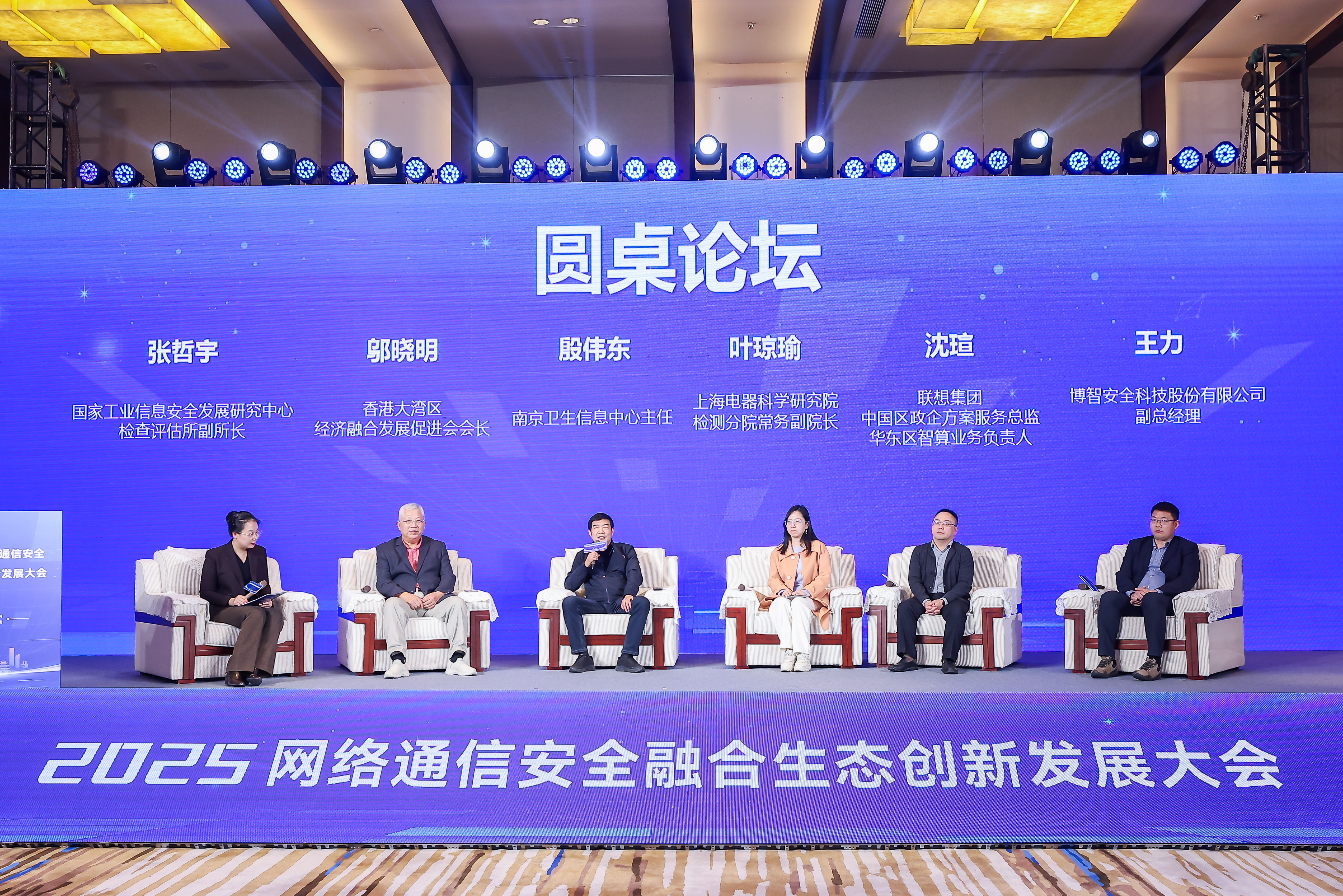 大会还举办了圆桌论坛,邀请国家工业信息安全发展研究中心检查评估所副所长张哲宇、香港大湾区经济融合发展促进会会长邬晓明、南京卫生信息中心主任殷伟东、上海电器科学研究院检测分院常务副院长叶琼瑜、联想集团中国区政企方案服务总监/华东区智算业务负责人沈瑄、博智安全科技股份有限公司副总经理王力就网络通信安全产业如何创新发展开展研讨,搭建起跨界交流的新平台。
