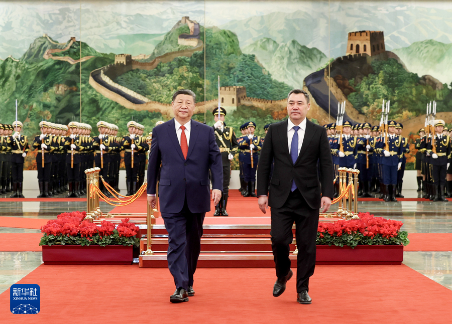 2月5日上午,国家主席习近平在北京人民大会堂同来华进行国事访问的吉尔吉斯斯坦总统扎帕罗夫举行会谈。这是会谈前,习近平在人民大会堂北大厅为扎帕罗夫举行欢迎仪式。新华社记者 申宏 摄