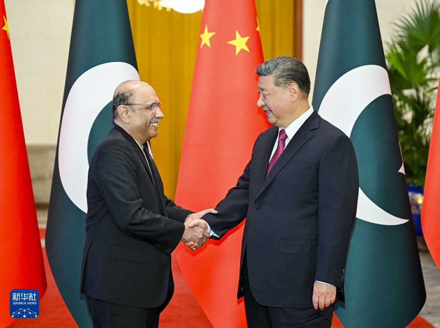 习近平指出,中国和巴基斯坦是铁杆朋友和全天候战略合作伙伴。历久弥坚的中巴传统友谊由两国老一辈领导人亲手缔造,是两国和两国人民的宝贵财富。近年来,双方坚定相互政治支持,保持密切高层交往,深入推进中巴经济走廊建设和各领域合作,树立了国与国关系典范。中方愿同巴方在各自现代化道路上携手前行,加快构建新时代更加紧密的中巴命运共同体,更好造福两国人民,为地区和平、稳定、繁荣作出更大贡献。
